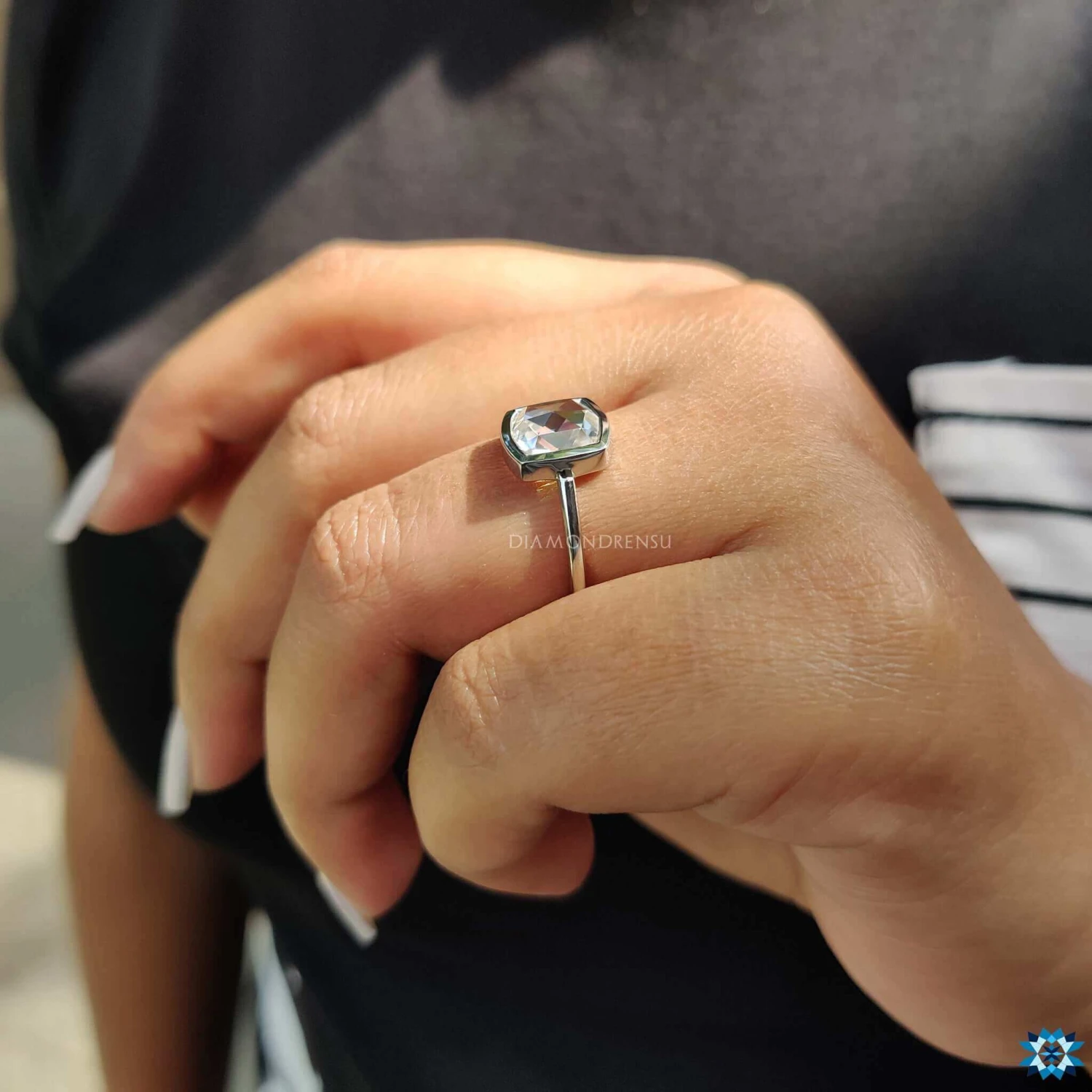 This beautiful cushion rose cut bezel set moissanite solitaire ring is the perfect blend of elegance and sophistication! The high polish and clear brilliance of the center cushion rose cut moissanite make this engagement ring a stunning addition to your collection. With a simple bezel set design, it’s comfortable to wear.