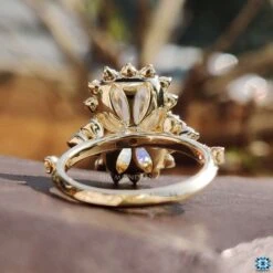 This listed beautiful moissanite engagement ring comes with a center shine of cushion cut moissanite that has held in simple claw prongs. The ring looks great with the beautiful floating bubble halo setting of colorless round moissanite. The listed ring also includes a distance pave setting.