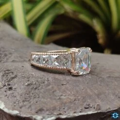 This moissanite engagement ring showcases the classic beauty of emerald cut moissanite held in claws. In addition, the french cut set in milgrain outline channel set adds a modern touch to this unique moissanite engagement ring. The center stone is sure to shine when set in this breathtaking graduated milgrain tapered channel set. Many couples who are looking for something unique turn to the best moissanite engagement rings.