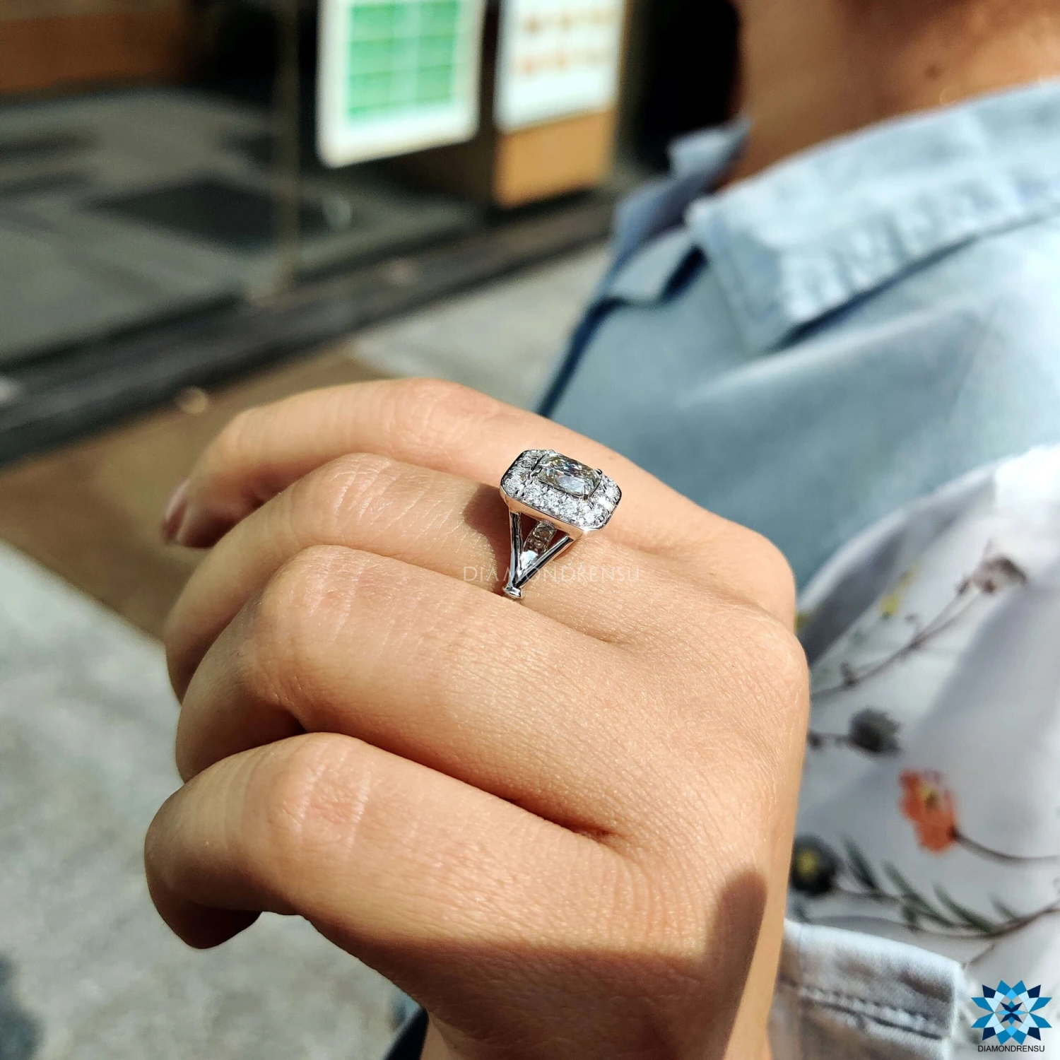 If you are looking for a romantic yet bold design, this lovely moissanite engagement ring will match your highest expectations without any compromise. Twinkling round moissanite surrounding the center cushion divine moissanite and gives a unique shine to it.