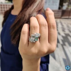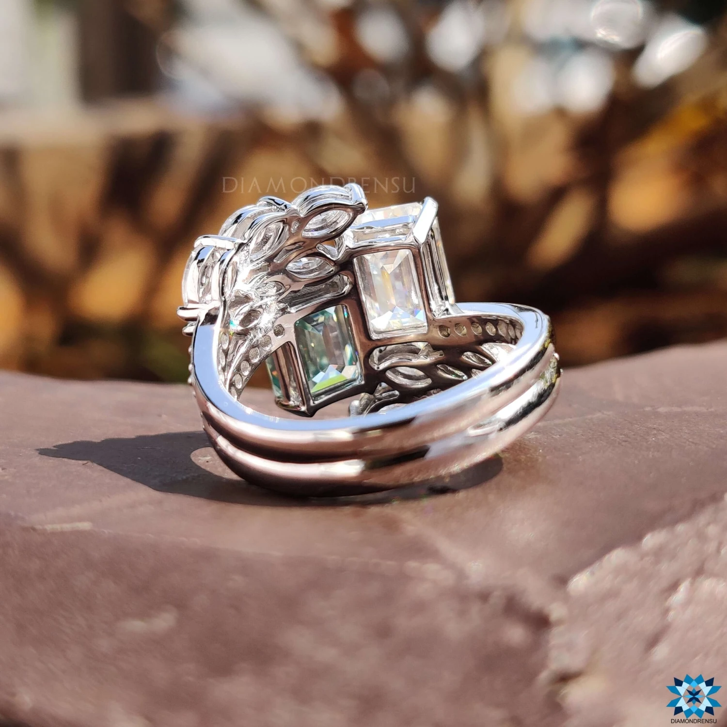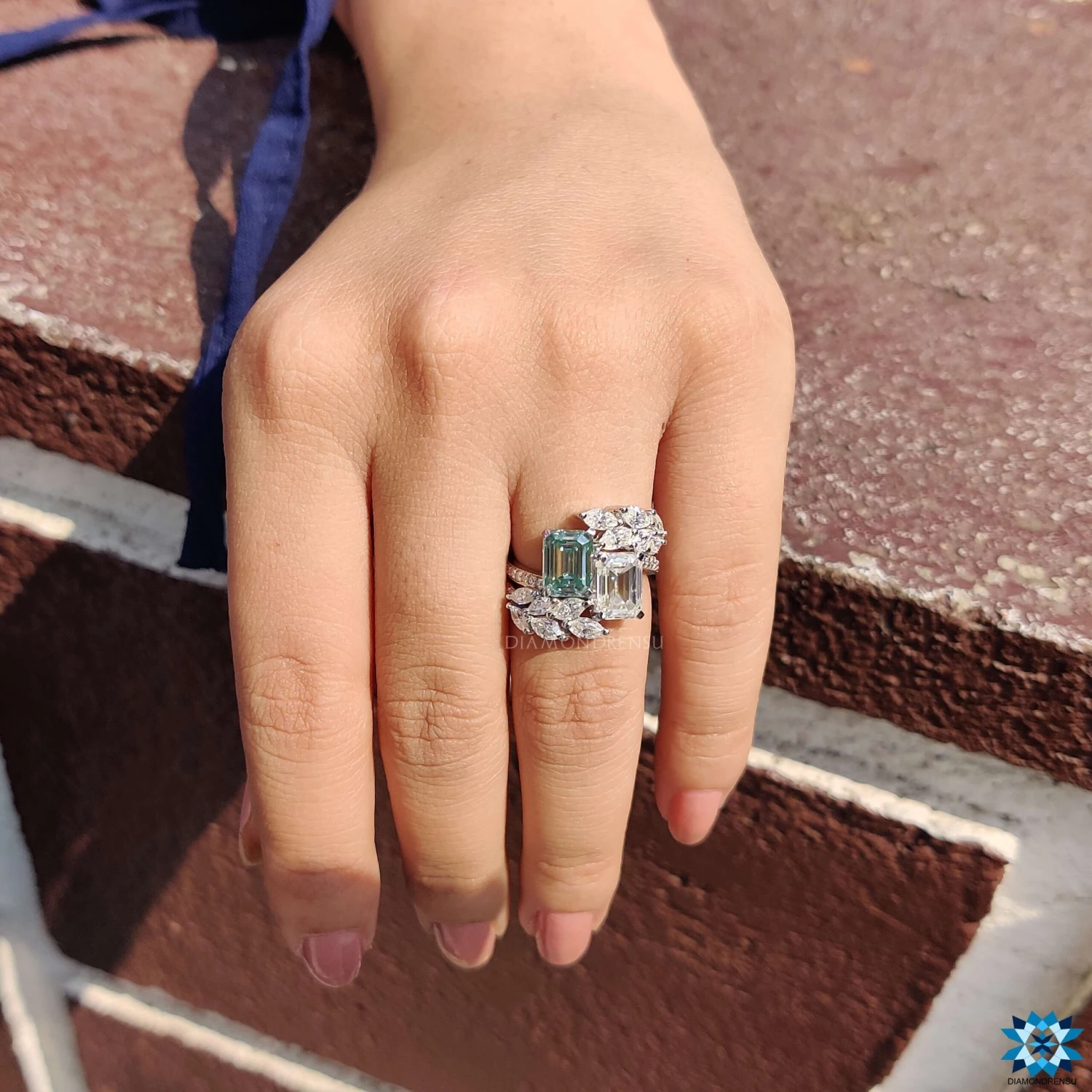 This unique moissanite engagement ring features a classic and best pair of cyan blue and colorless emerald cut set in a basket setting. dual row of the colorless marquise cut set with prong setting. The decorative bypass setting of the marquise cut gives a vintage touch to the listed moissanite diamond engagement ring. The ring features an emerald cut, but it can also be customized with a shape of your choice.