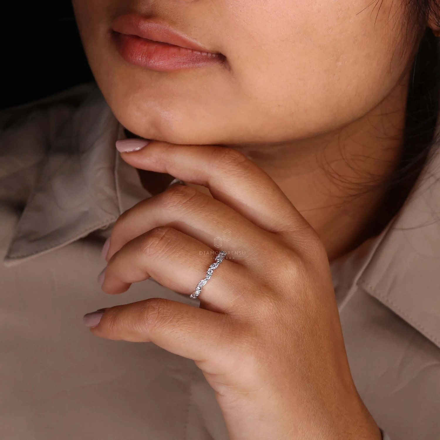 The gorgeous round set on the zig zag wedding band pattern adds to the allure of the lab grown diamond band, especially since the front aspect will remind you of a cathedral. We will make your ideal ring come true if you want customized add-ons.