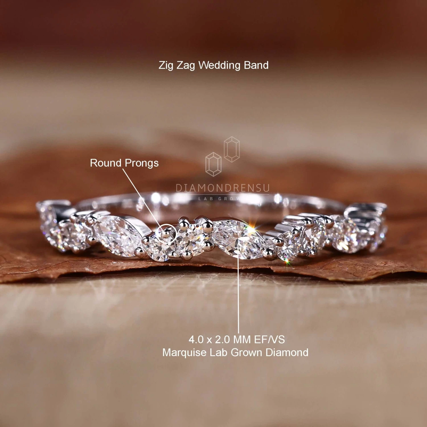 Celebrate with us your special day and make it even more memorable and precise with our two stone marquise and round lab grown diamond zig zag band setting. Presenting this unique zig zag setting, half eternity band for your love. This marquise and round lab grown diamond band adds charm to your anniversary gift ring.