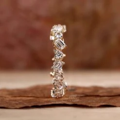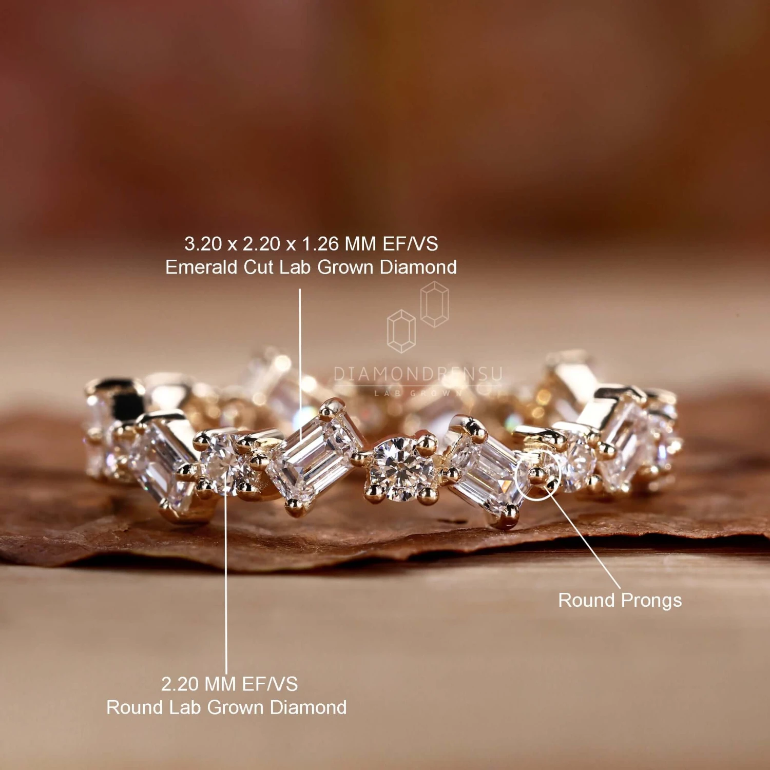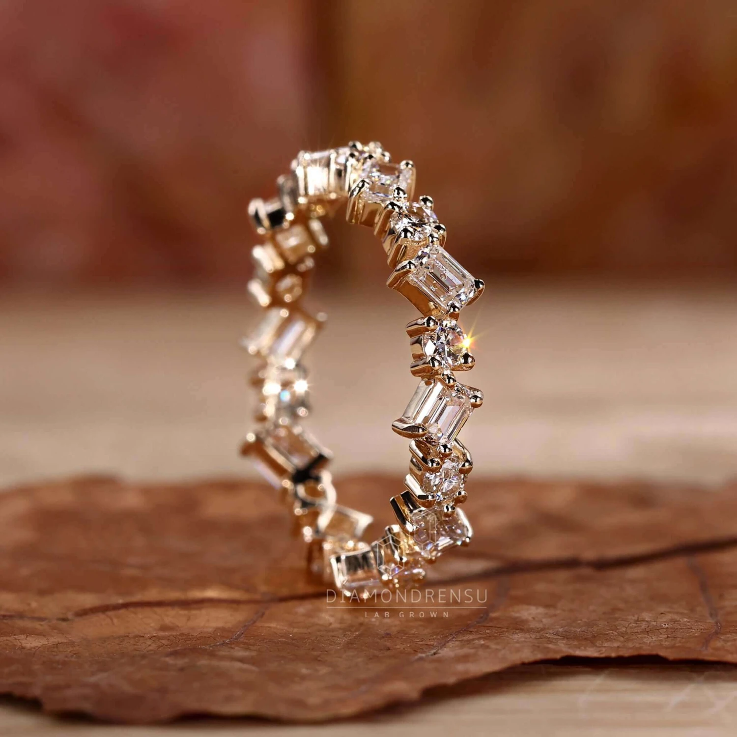 As a full eternity ring, the emerald and round lab grown diamond band features diamonds that wrap around the entire band, symbolizing everlasting love and commitment. This makes it a perfect choice as a full eternity band or anniversary band, symbolizing the endless bond between you and your partner. The combination of emerald-cut and round-cut lab-grown diamonds adds a touch of sophistication and versatility, making it a perfect match for a variety of engagement rings or as a standalone statement piece.